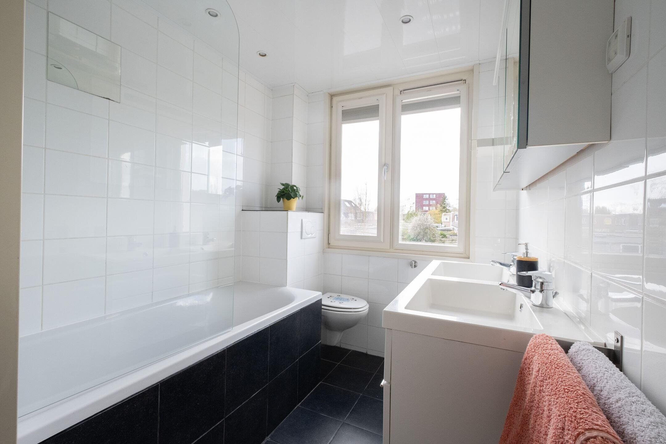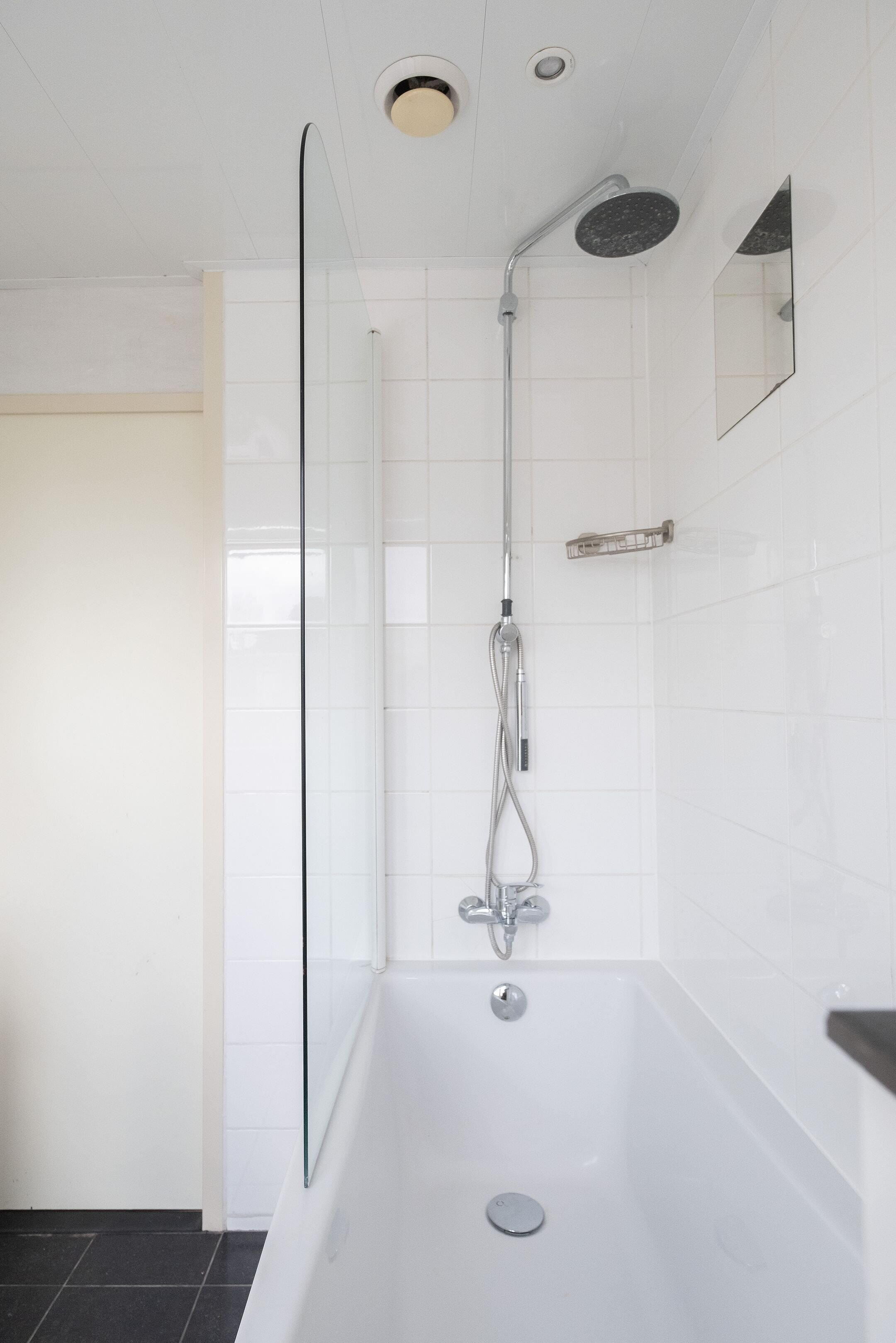 De badkamer is voorzien van een ligbad, dubbele wastafel en hangend toilet. Het raam en de mechanische ventilatie zorgen voor een goed geventileerde ruimte.